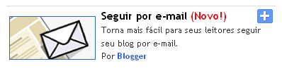 Seguir por e-mail é um novo gadget que se pode utilizar clicando em adicionar um Gadget no Design. Se trata de um botão para receber feeds que funciona via feedburner.